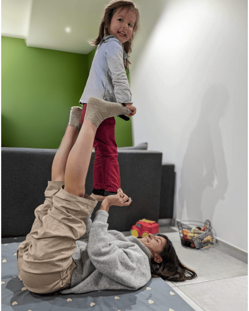 Danseuse professionnelle depuis plus de dix ans, j’ai traversé de nombreuses scènes et pratiques, de l’acrobatie à la danse contact. En devenant mère, cette pratique s’invite au quotidien avec ma fille : jouer avec les appuis, explorer les portés, découvrir ensemble comment nos corps dialoguent.